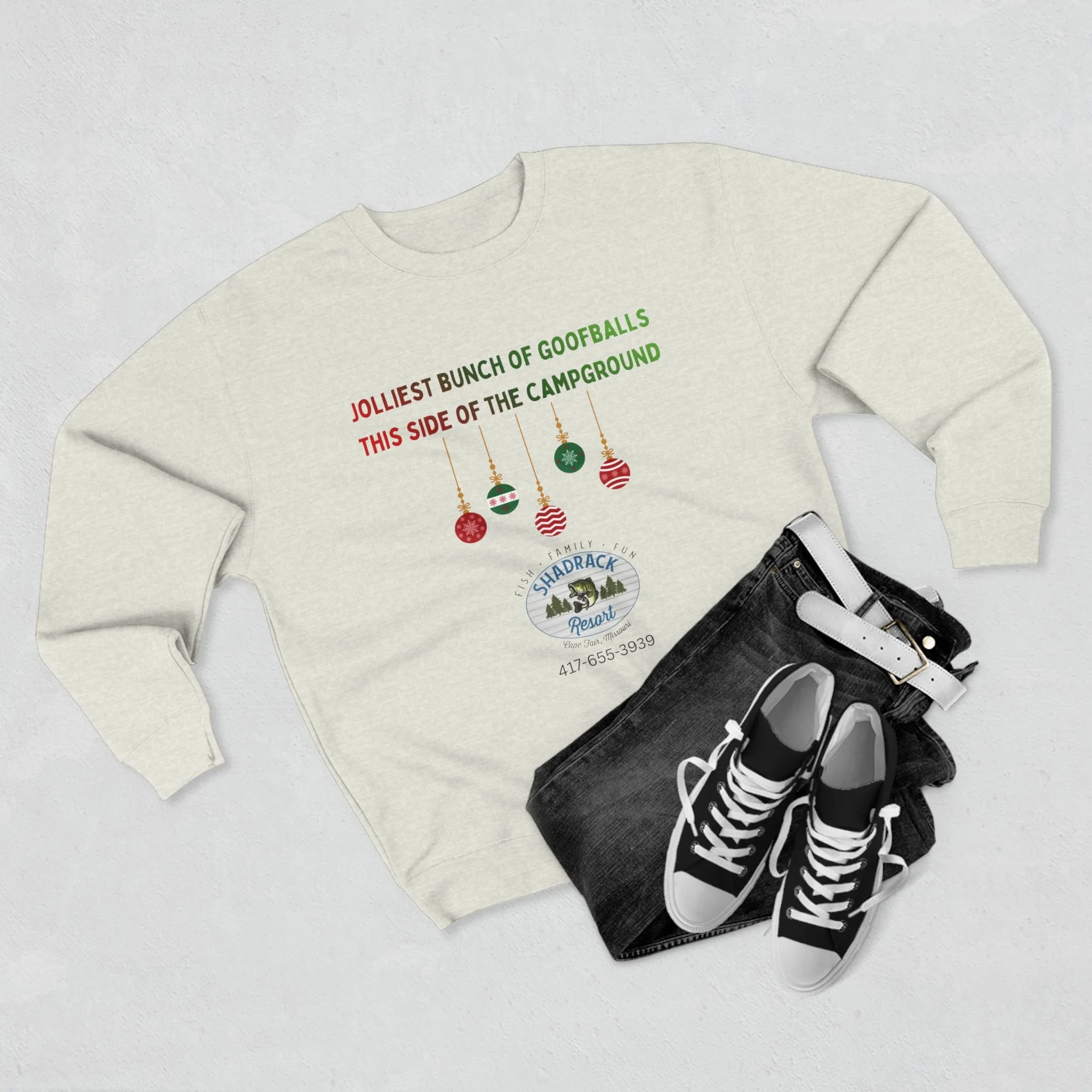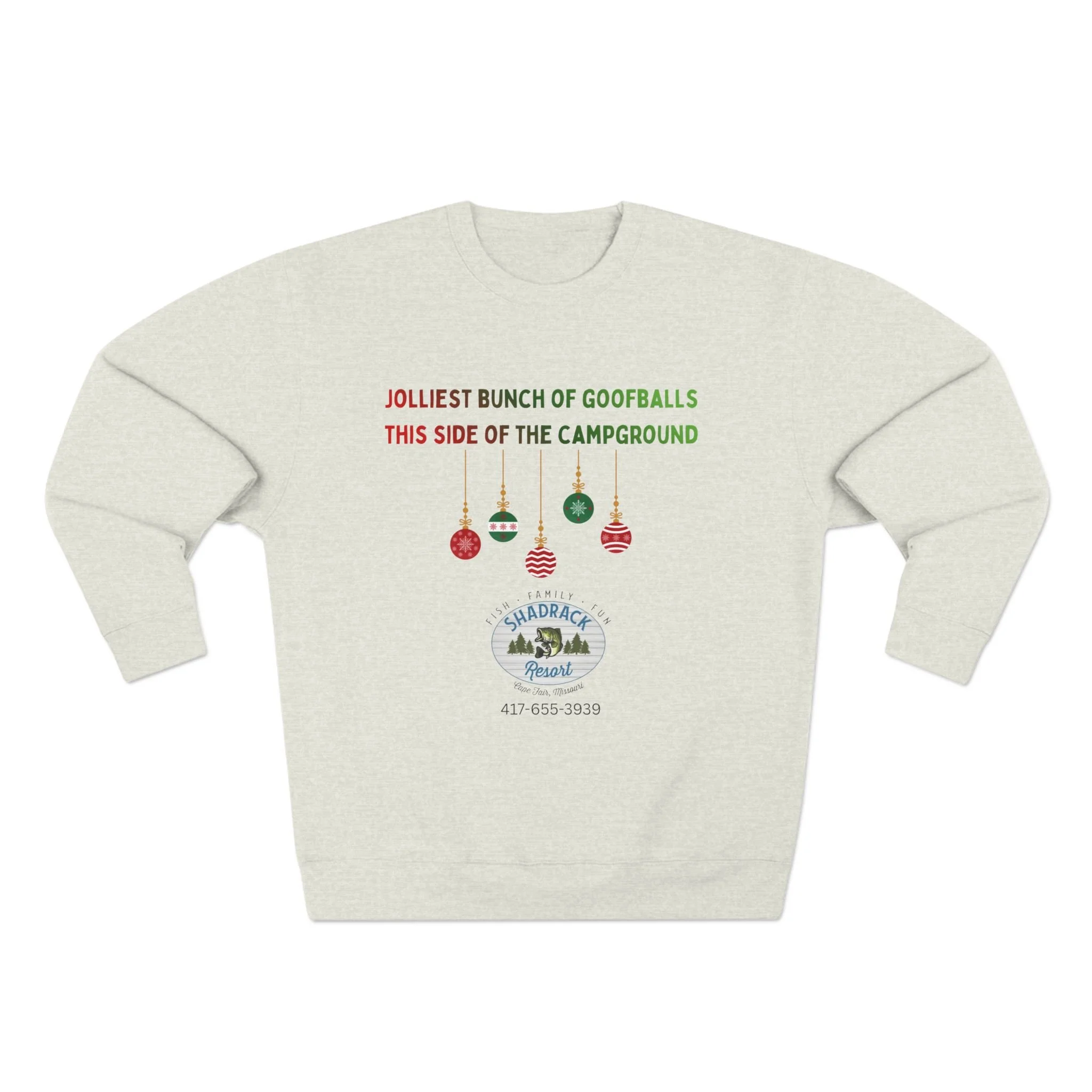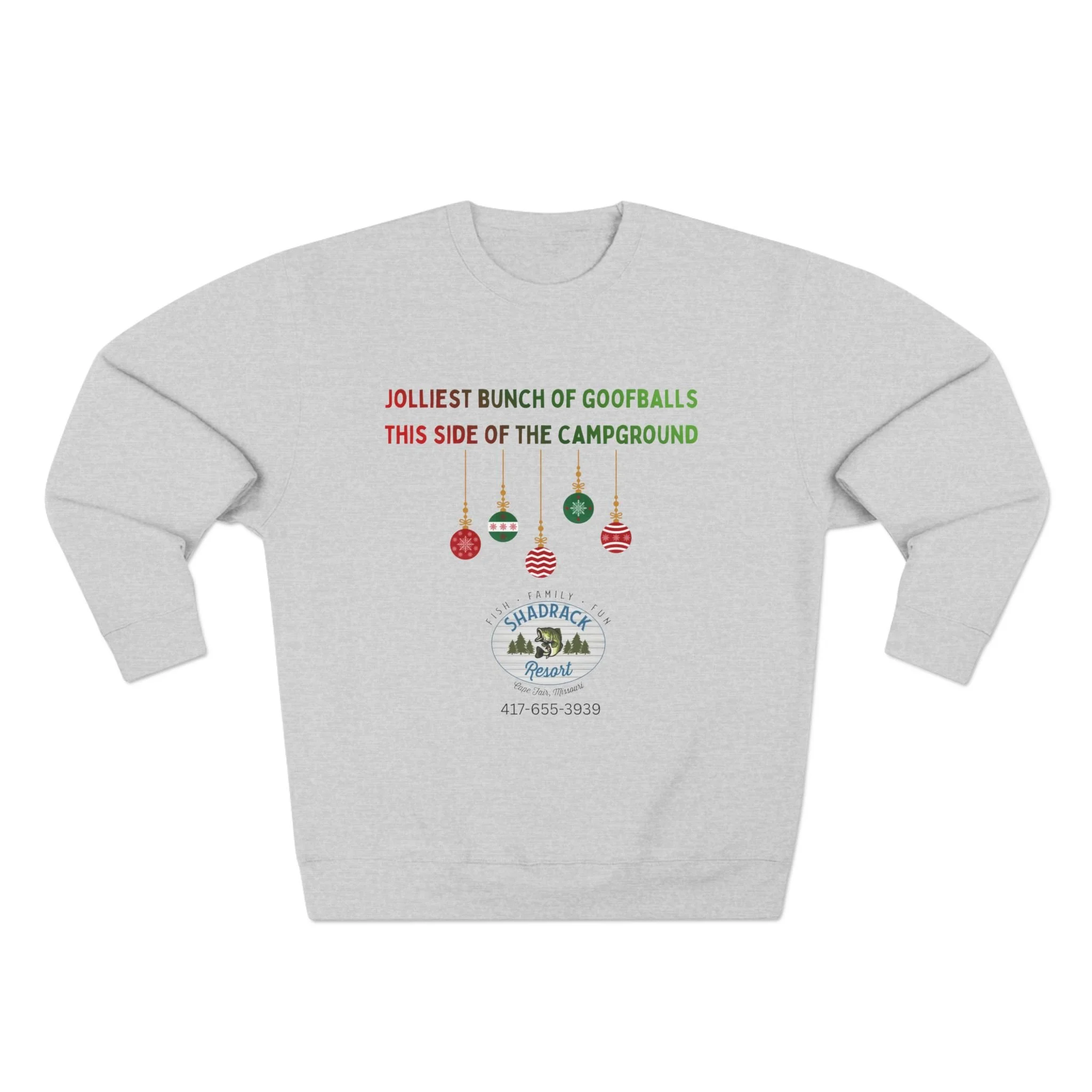 This cozy crewneck sweatshirt carries a lighthearted campground holiday vibe — soft fleece that feels like a warm campfire night with friends. The front shows playful ornaments and a vintage campground badge with the phrase “Jolliest bunch of goofballs this side of the campground,” adding personality without shouting. Wear it on cool mornings by the lake, at low-key holiday gatherings, or while trimming a tree in the RV. The regular fit and medium-heavy fabric make it a comfortable layer for outdoor hangs or relaxed days at home. It settles into everyday life easily: pulls on after a hike, pairs with jeans for an evening by the fire, and keeps you comfortable while sharing stories and laughter around the campsite.