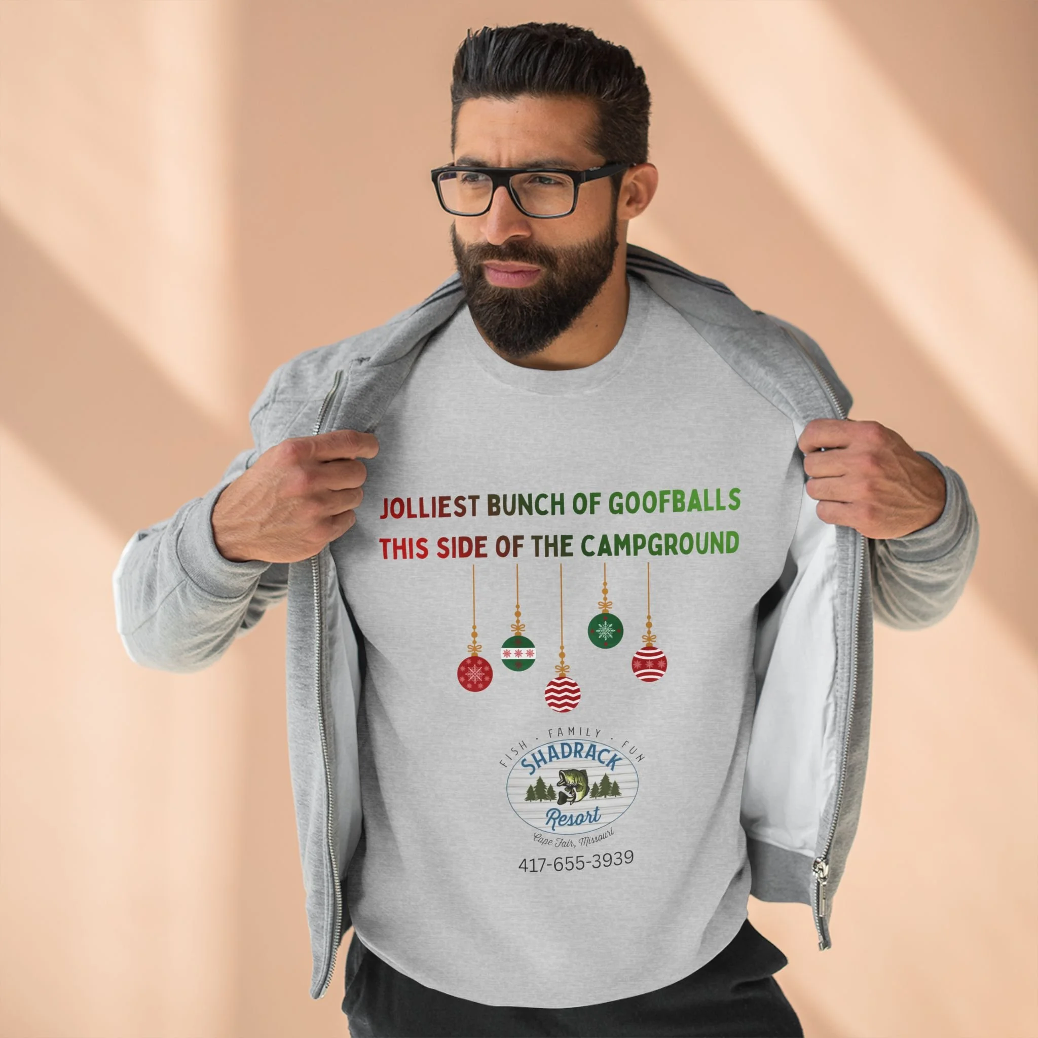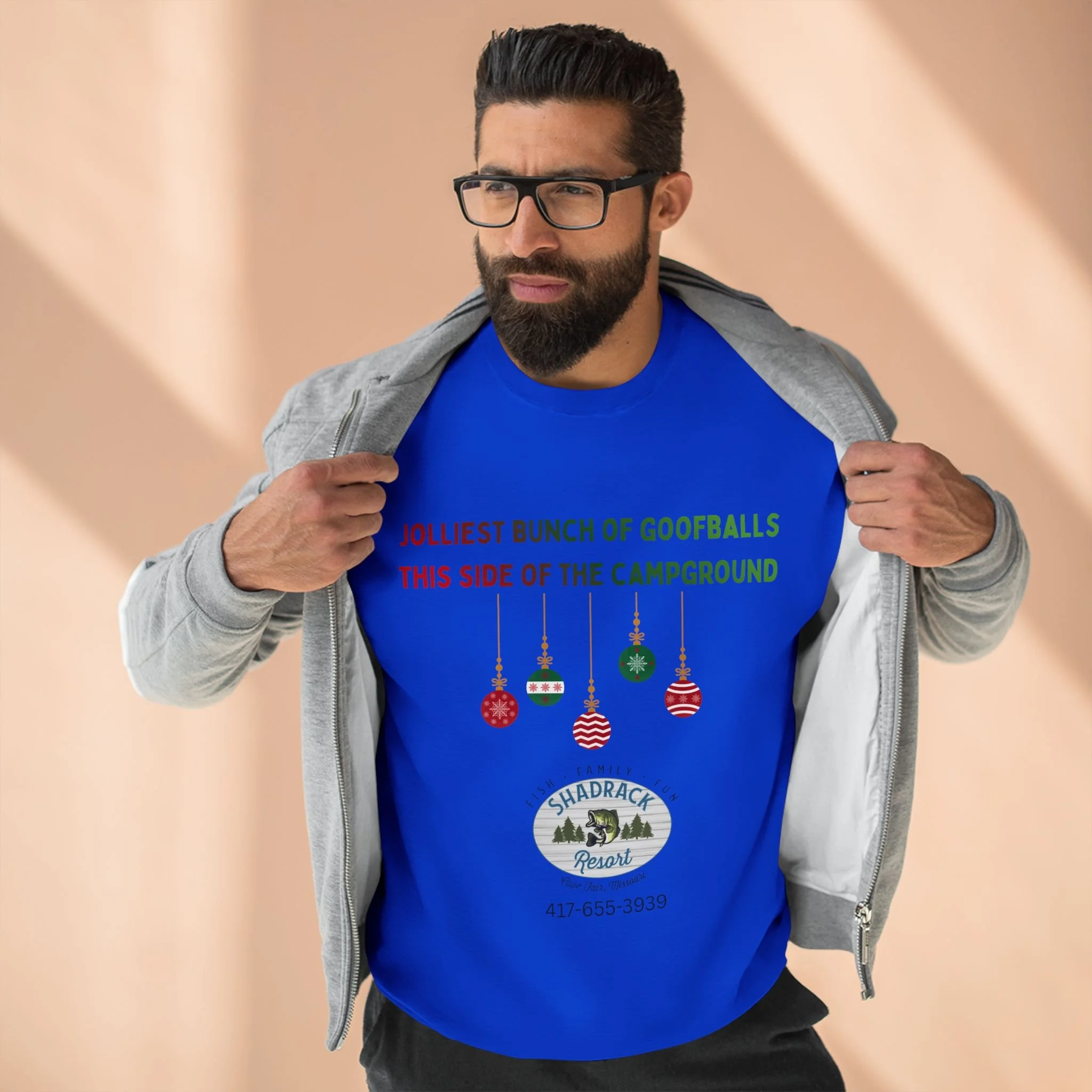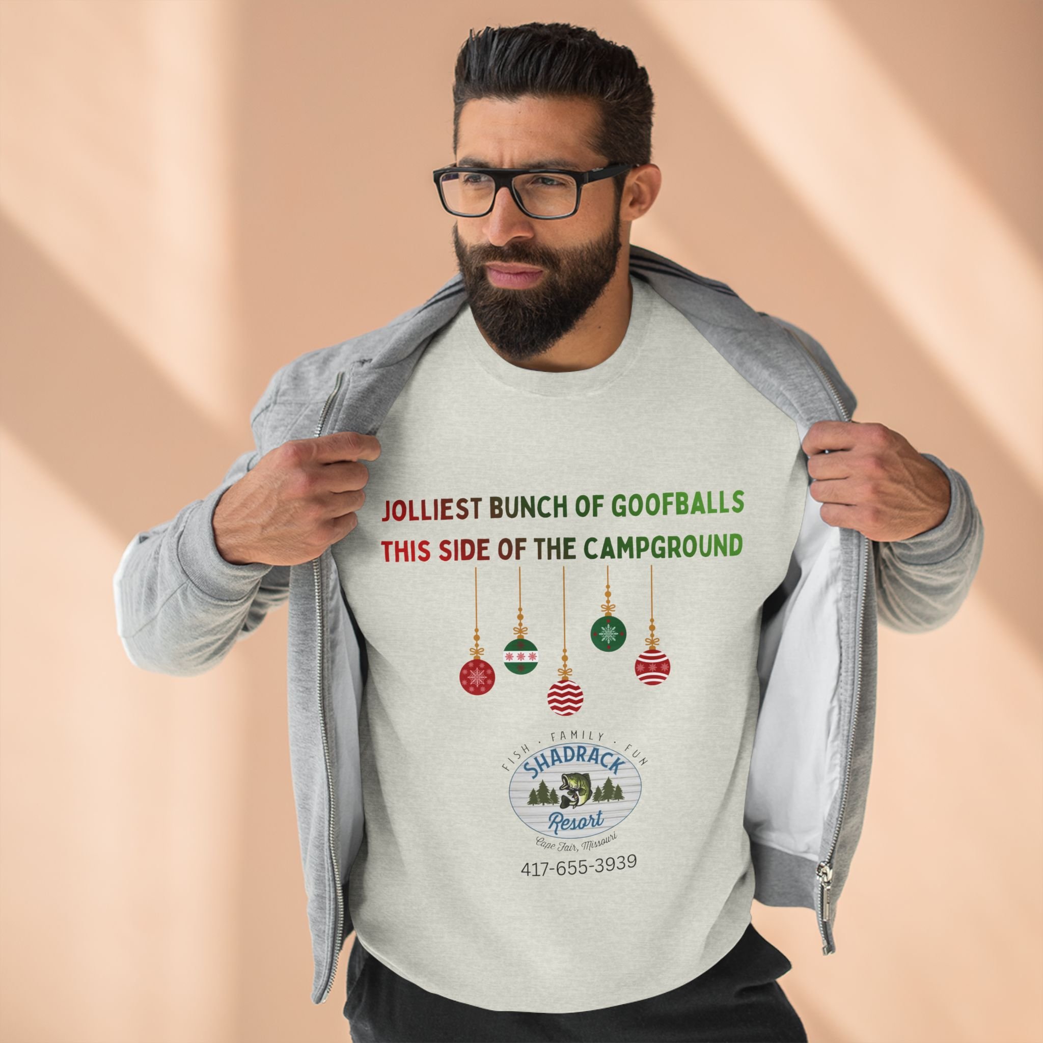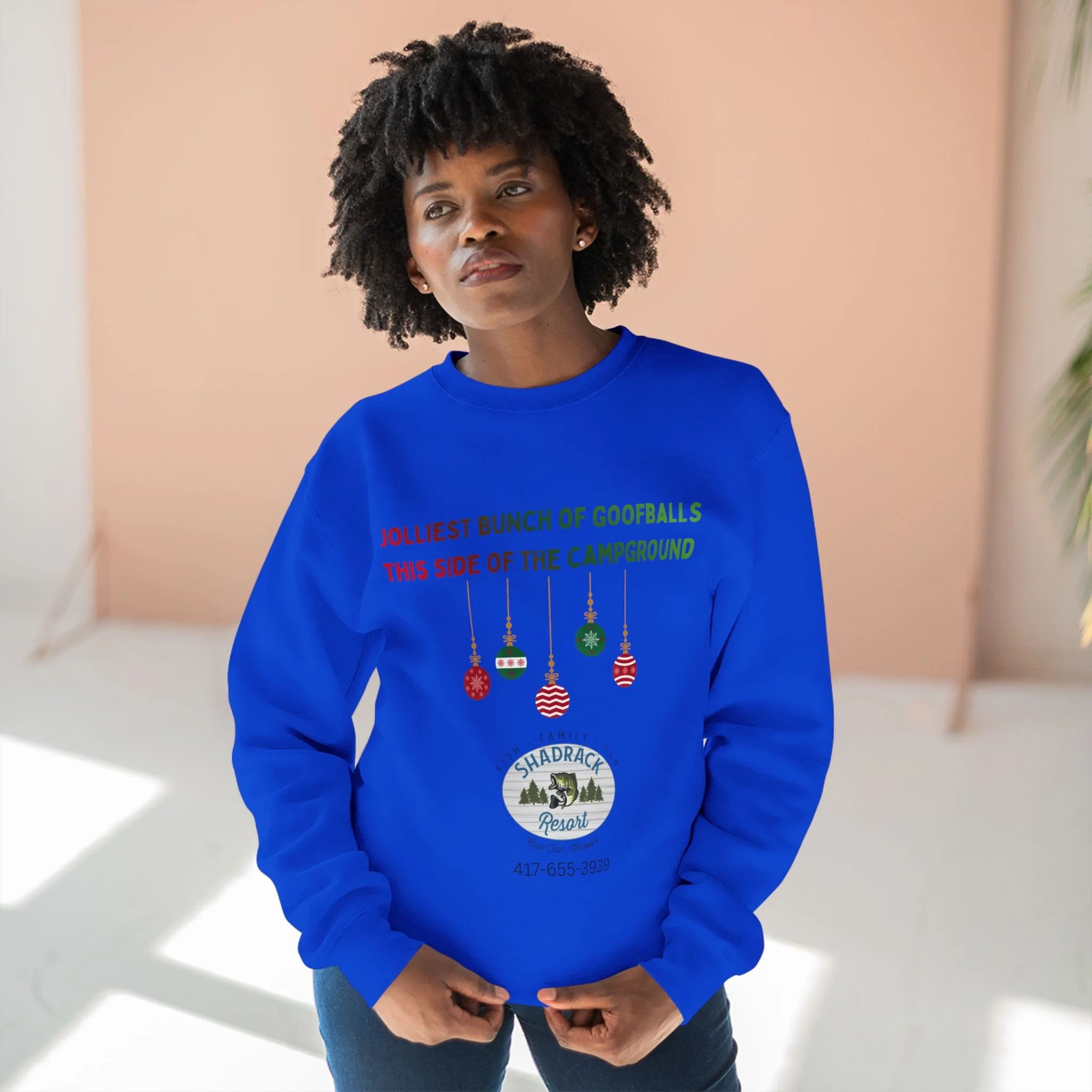 This cozy crewneck sweatshirt carries a lighthearted campground holiday vibe — soft fleece that feels like a warm campfire night with friends. The front shows playful ornaments and a vintage campground badge with the phrase “Jolliest bunch of goofballs this side of the campground,” adding personality without shouting. Wear it on cool mornings by the lake, at low-key holiday gatherings, or while trimming a tree in the RV. The regular fit and medium-heavy fabric make it a comfortable layer for outdoor hangs or relaxed days at home. It settles into everyday life easily: pulls on after a hike, pairs with jeans for an evening by the fire, and keeps you comfortable while sharing stories and laughter around the campsite.
